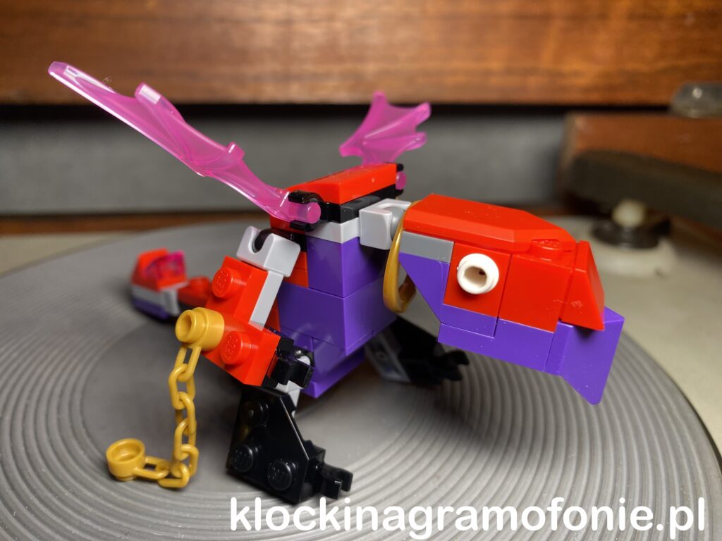 Maj 2025 roku był jak do tej pory miesiącem najbogatszym w akcje „Zbuduj i weź” w sklepach stacjonarnych Lego. Niecałe dwa tygodnie po Grogu, w dniach 14 i 15.05 mieliśmy możliwość zbudowania miniwersji Smoka Chaosu z serii Ninjago – Kiełogrzmotu. W tej wersji Smok może poruszać wszystkimi kończynami, skrzydłami oraz ogonem i głową. Muszę też przyznać, że wygląda zdecydowanie przyjaźniej i nie tak psychodelicznie jak pełnowymiarowy (dorosły?) osobnik. Pazura dodaje mu obręcz wokół szyi i dwa łańcuchy przyczepione do rąk.